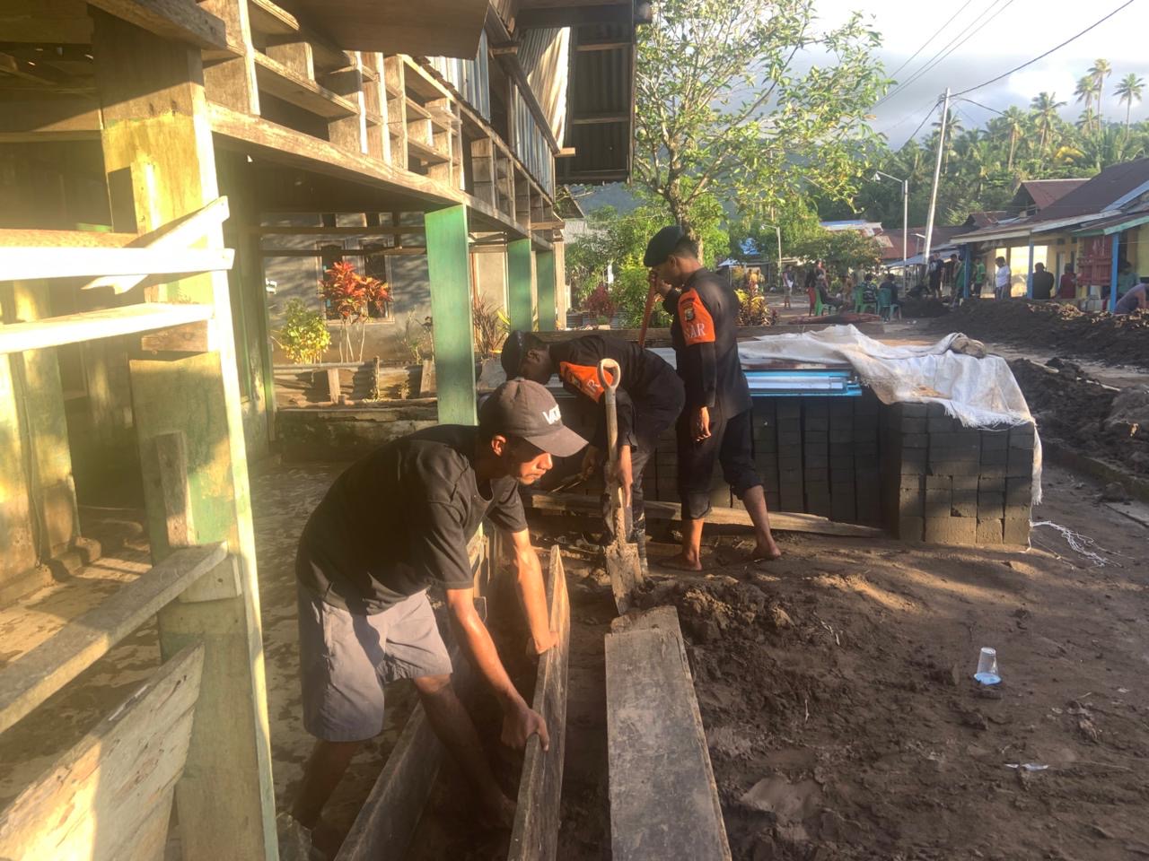 Di Desa Doitia, Kecamatan Loloda Utara, personel Satbrimob terlihat bekerja bahu-membahu dengan tim gabungan dan masyarakat setempat.