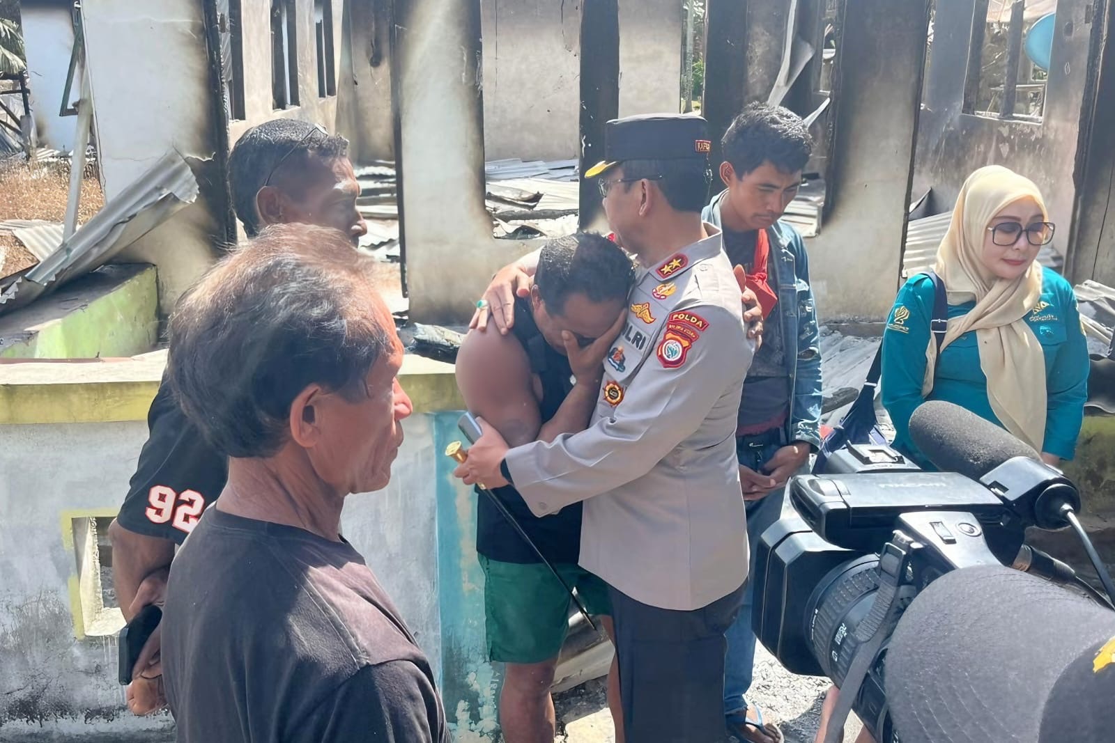 Di satu sisi, suasana haru tak terbendung saat Kapolda memeluk seorang warga yang menangis di tengah puing bangunan yang hangus terbakar. Warga tersebut tampak menunduk, larut dalam kesedihan, sementara Kapolda menenangkan dengan pelukan hangat, sebuah gambaran nyata luka yang ditinggalkan konflik.