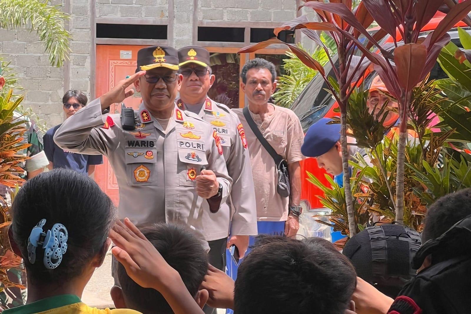 Namun di sisi lain, harapan justru terlihat dari wajah anak-anak yang menyambut kedatangan Kapolda. Dengan polos dan penuh semangat, mereka berdiri berjajar sambil memberi salam hormat dan menyanyikan lagu Indonesia Raya. Kapolda pun membalas dengan senyum dan gestur hangat, menciptakan suasana yang kontras dari duka menuju harapan.