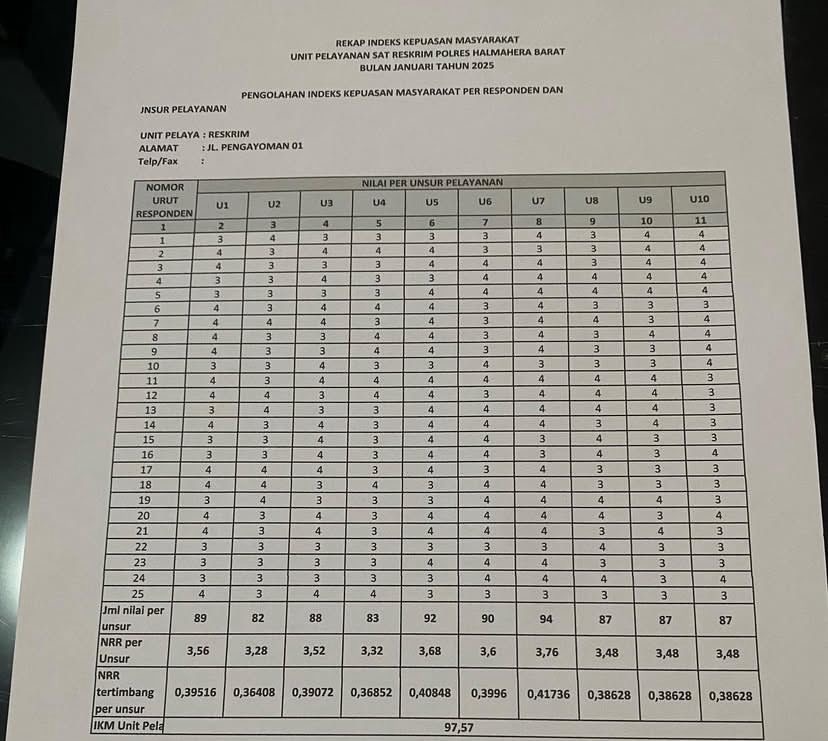 Satreskrim polres halmahera barat melaksanakan Survei Kepuasan Masyarakat (SKM) sebagai bentuk evaluasi terhadap kualitas pelayanan publik. Hasil survei periode menunjukkan peningkatan signifikan dalam tingkat kepuasan masyarakat terhadap layanan yang diberikan.
