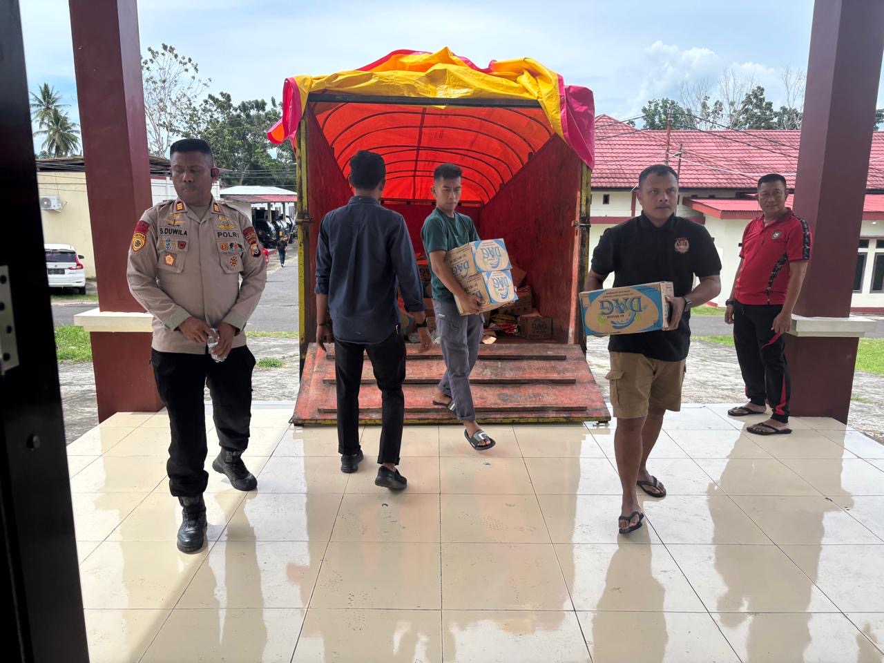 Didampingi para perwira Polres Halbar, Kapolres menyerahkan bantuan tersebut secara simbolis kepada warga di posko pengungsian. Bantuan yang disalurkan berupa kebutuhan pokok, air minum, serta perlengkapan sehari-hari untuk membantu memenuhi kebutuhan dasar masyarakat pascabencana.