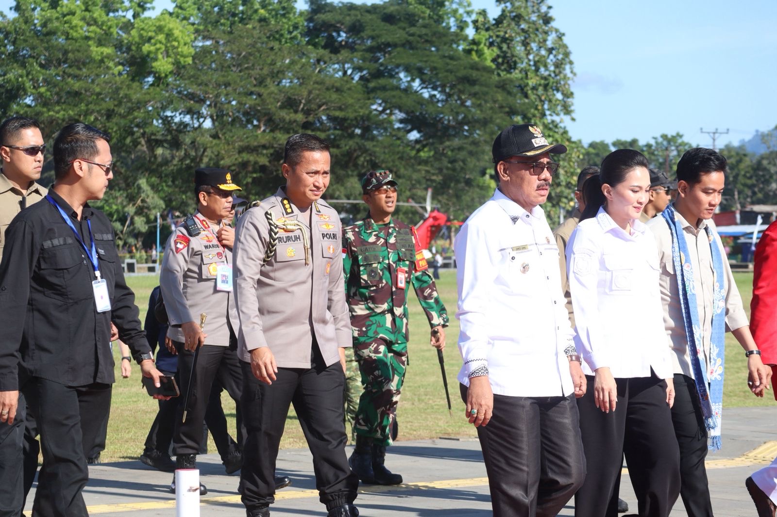 Rombongan Wapres tiba di Lapangan Sasadu Lamo menggunakan tiga helikopter TNI Angkatan Udara jenis NAS-332 Super Puma yang tergabung dalam misi dukungan VVIP RI-2. Kedatangan rombongan disambut hangat oleh Forkopimda Kabupaten Halmahera Barat, termasuk jajaran Polres Halbar yang bertugas melakukan pengamanan di seluruh titik kegiatan.