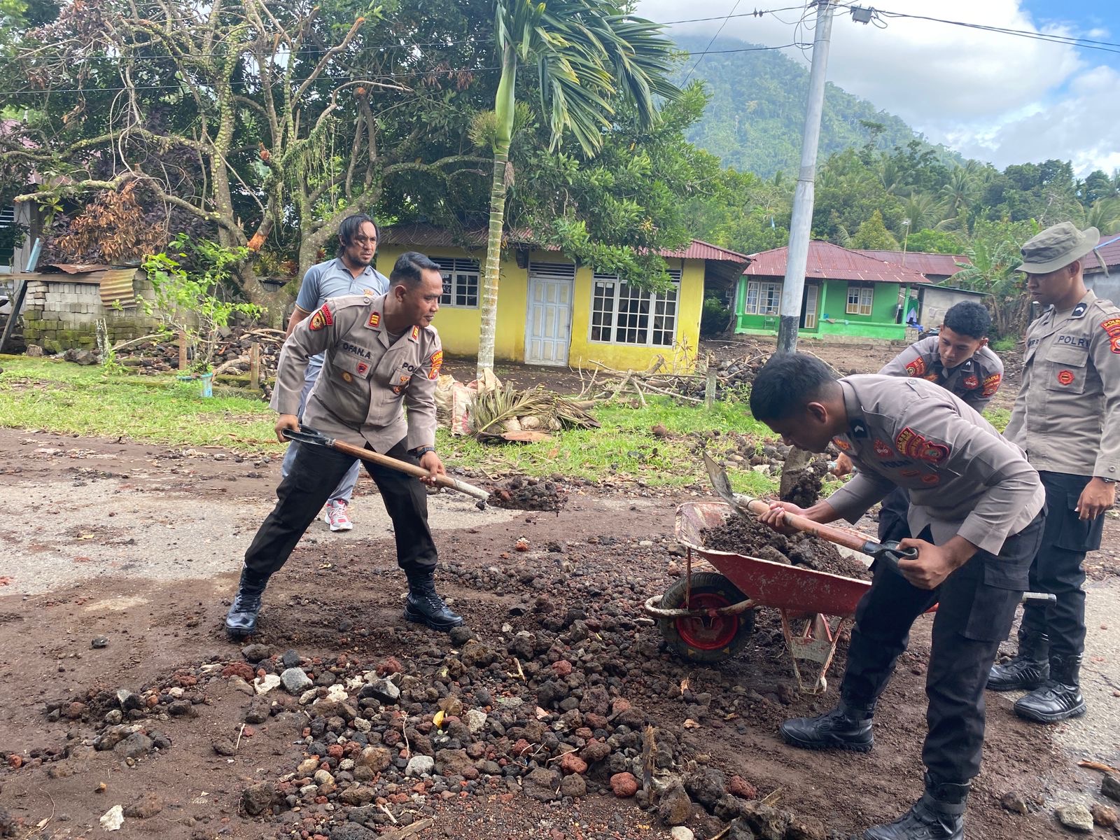 Halmahera Barat – Personel Satuan Samapta Polres Halmahera Barat melaksanakan kegiatan pembersihan material batu dan tanah yang terbawa banjir di bahu jalan raya pada Selasa (7/10/2025)Kegiatan ini dilakukan menyusul tingginya curah hujan yang mengguyur wilayah Halmahera Barat dalam beberapa hari terakhir.
