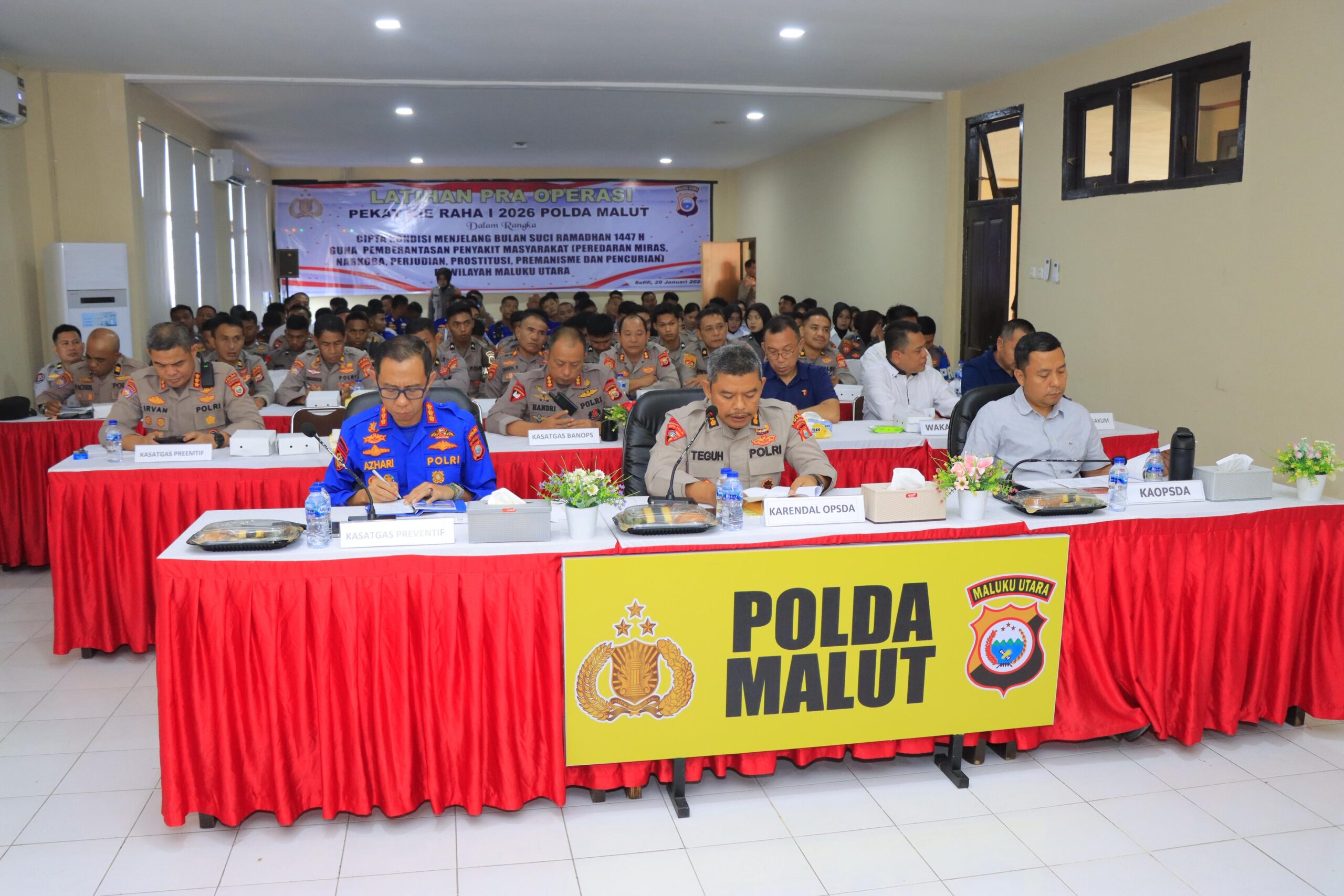 HUMAS POLDA MALUT – Polda Maluku Utara menggelar Latihan Pra Operasi (Latpra Ops) Pekat Kie Raha I Tahun 2026 sebagai langkah awal pemberantasan penyakit masyarakat menjelang bulan suci Ramadan 1447 Hijriah. Kegiatan tersebut dibuka oleh Kepala Biro Operasi Polda Maluku Utara, Kombes Pol. Teguh Kariyadi, S.I.K., mewakili Kapolda Maluku Utara, Kamis (29/1/2026).