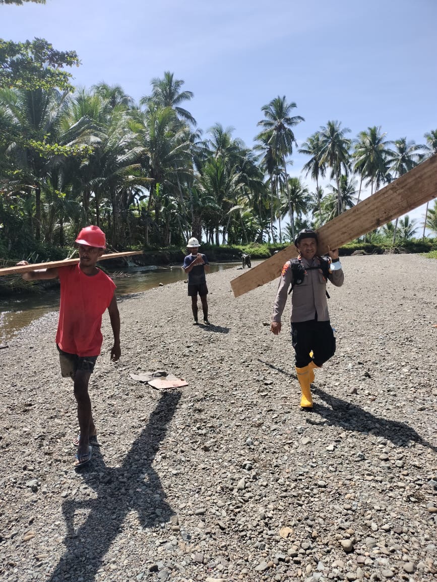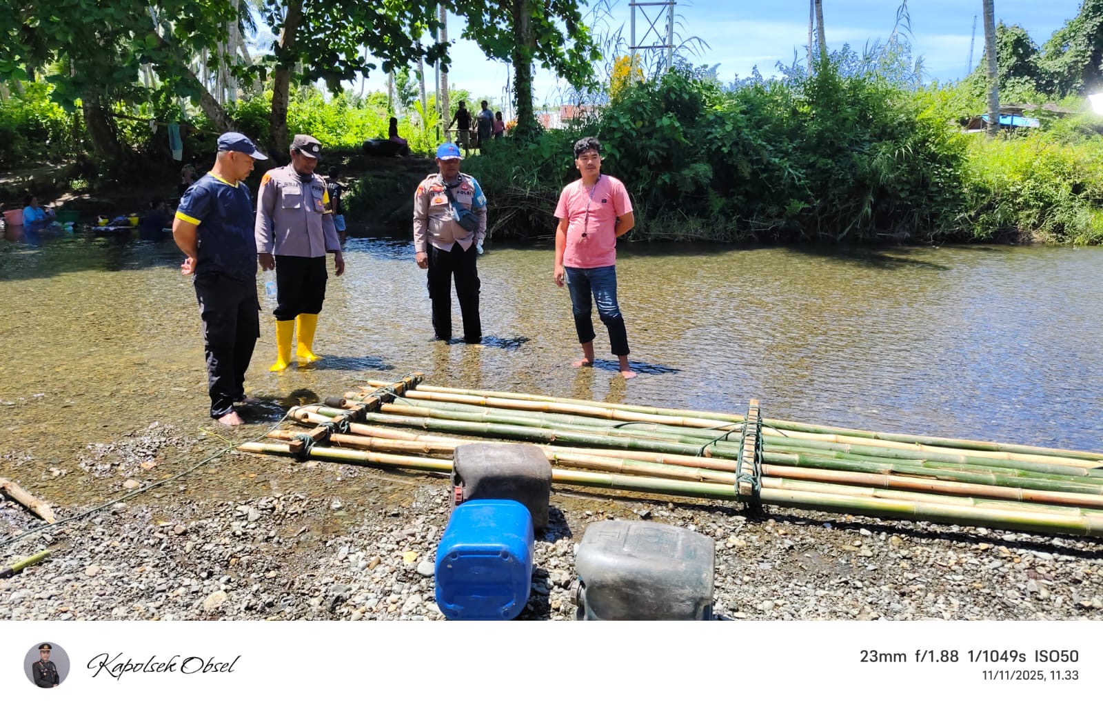 Kapolsek Obi Selatan, IPDA Samsudin Upara, S.H., memimpin langsung kegiatan tersebut bersama sejumlah personel Polsek dan warga sekitar. Mereka bergotong royong mengumpulkan bahan kayu serta drum pelampung untuk membuat rakit sederhana yang kuat dan aman digunakan.
