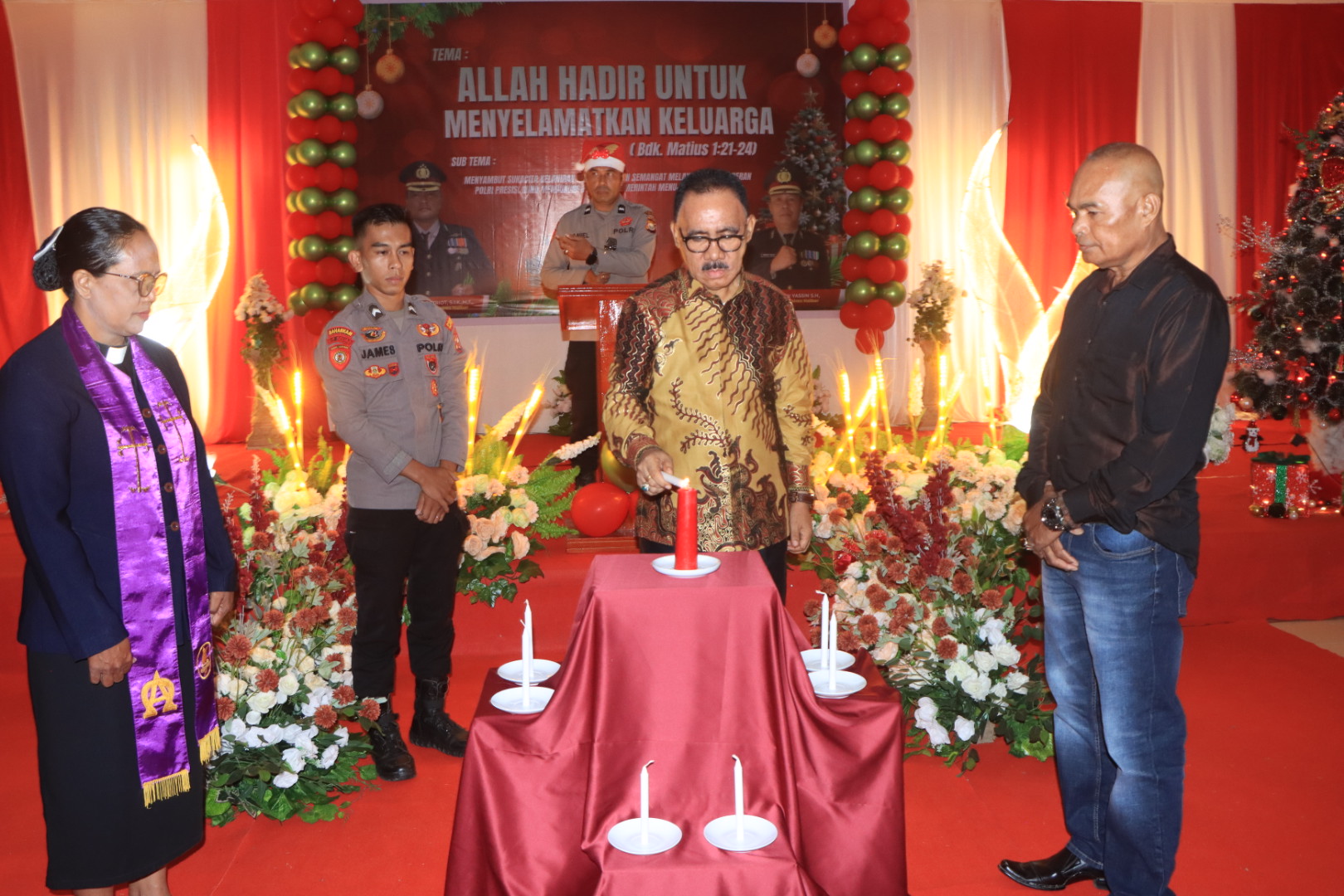 Kapolres Halbar AKBP Teguh Patriot, S.I.K dalam sambutannya menekankan bahwa tema Natal “Allah Hadir Untuk Menyelamatkan Keluarga” menjadi pengingat bahwa keluarga adalah fondasi utama pembentukan karakter setiap pribadi, termasuk anggota Polri.