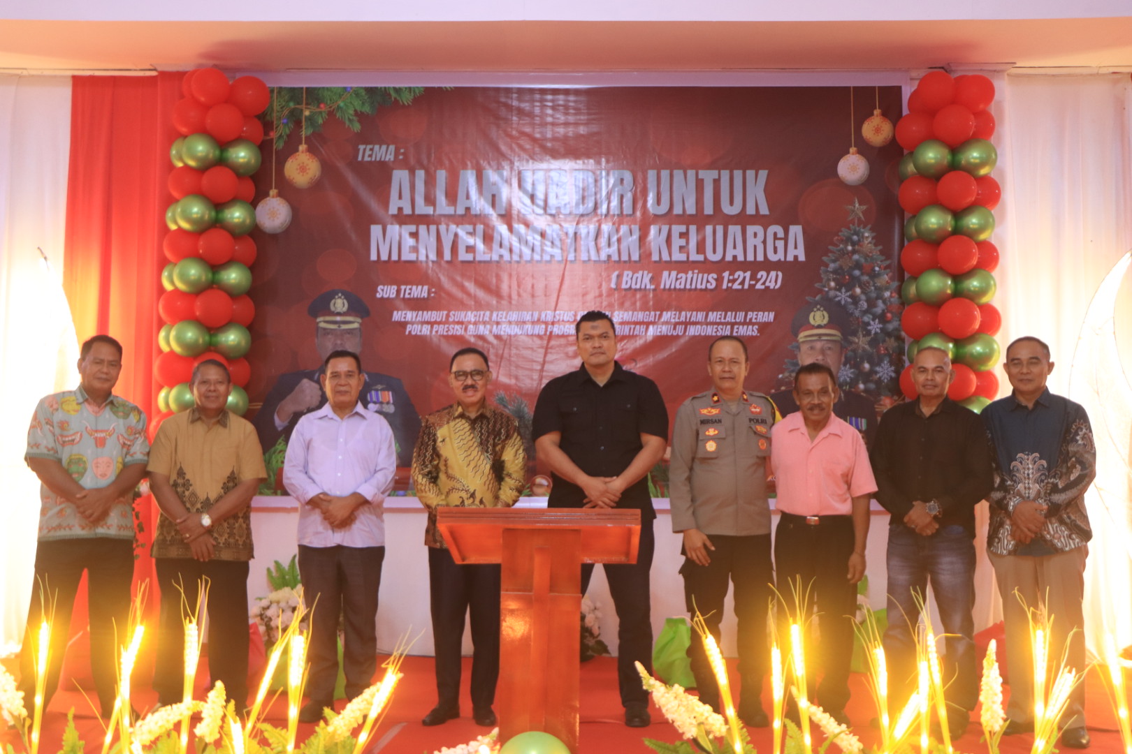 Kapolres Halbar AKBP Teguh Patriot, S.I.K dalam sambutannya menekankan bahwa tema Natal “Allah Hadir Untuk Menyelamatkan Keluarga” menjadi pengingat bahwa keluarga adalah fondasi utama pembentukan karakter setiap pribadi, termasuk anggota Polri.