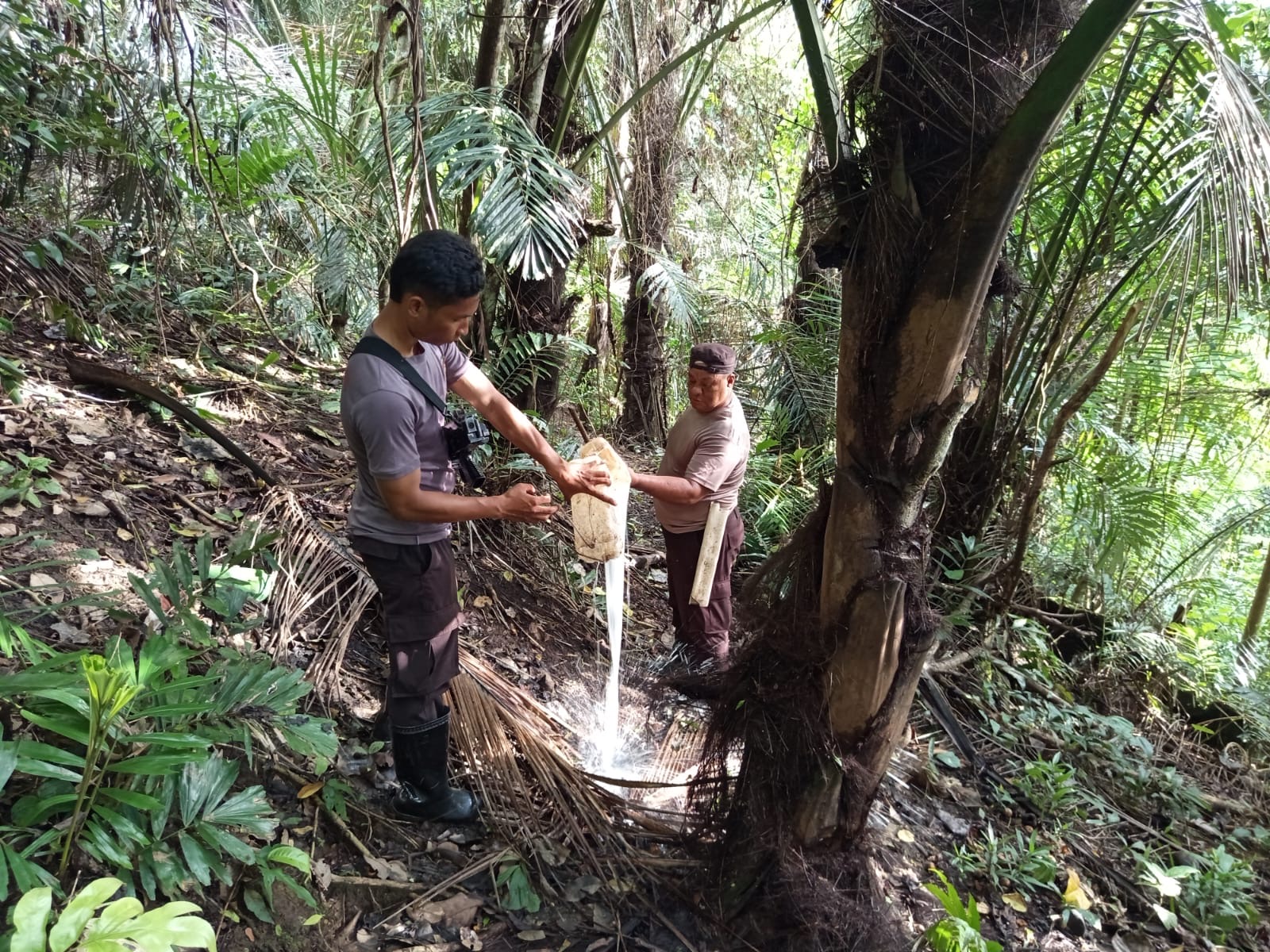 Selain itu, tim juga menemukan saguer yang masih menggantung di pohon aren sebagai bahan baku pembuatan miras.