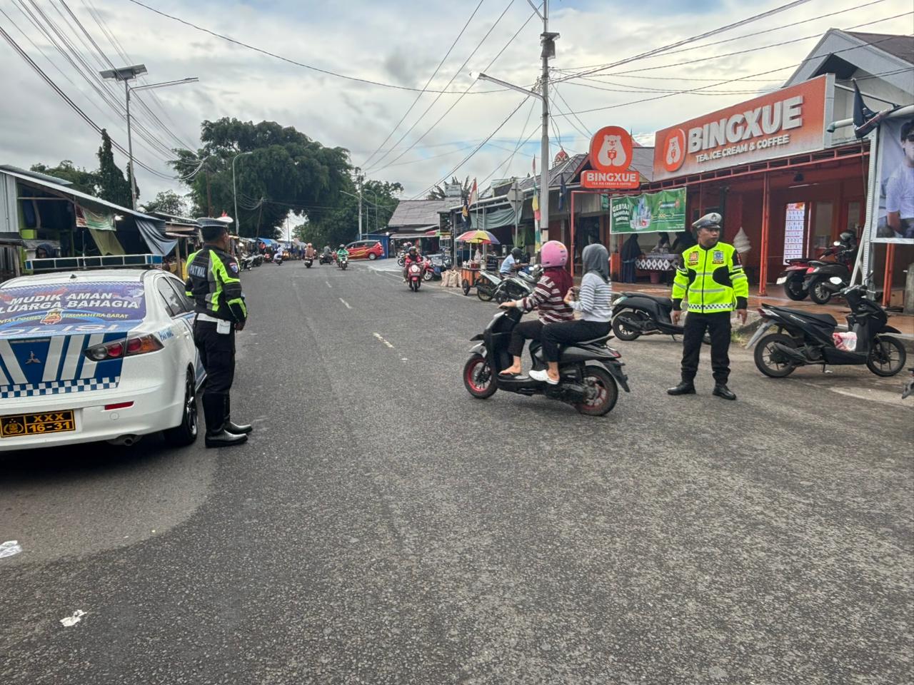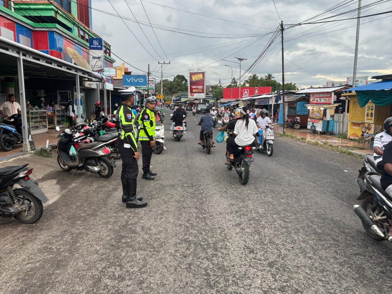 Halmahera Barat – Personel Satuan Lalu Lintas (Satlantas) Polres Halmahera Barat melaksanakan kegiatan pengaturan arus lalu lintas di kawasan Pasar Tumpah Ramadhan, Kecamatan Jailolo, Kabupaten Halmahera Barat, Senin (9/3/2026) sore.
