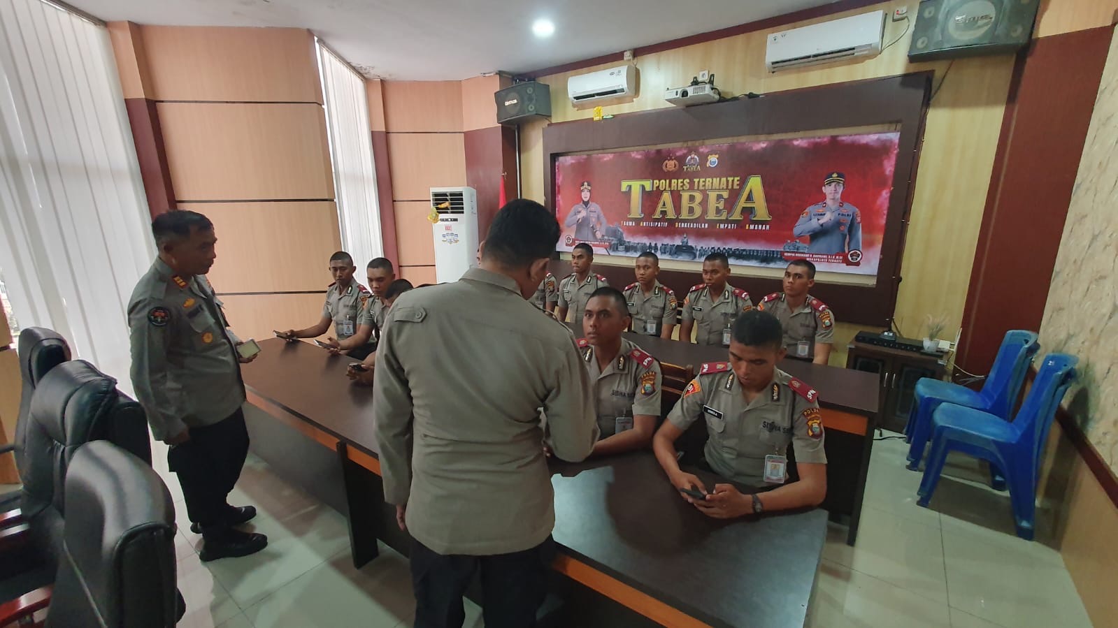 Dalam upaya menanamkan pemahaman tentang pentingnya peran kehumasan di tubuh Kepolisian, Kasi Humas Polres Ternate AKP Umar Kombong, S.H., bersama Kasubsi Penmas Aipda Akbar Hariman, memberikan sosialisasi bertema “Agen Kehumasan Polri” kepada para Siswa Latihan Kerja (Latja) SPN Polda Maluku Utara yang dilaksanakan di Ruang TMCC Polres Ternate, Jumat (07/11).