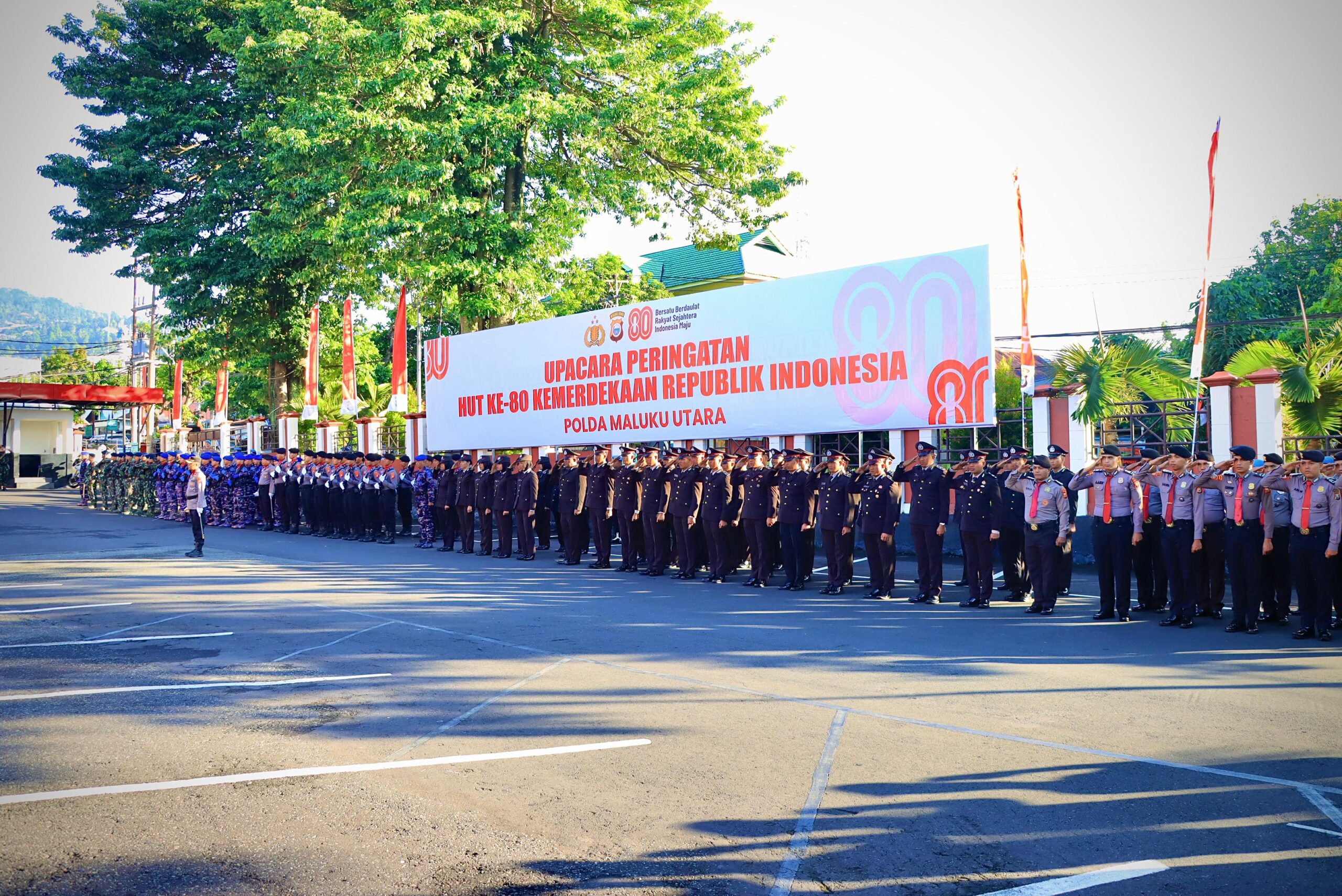 HUMAS POLDA MALUT – Wakapolda Maluku Utara Brigjen Pol. Stephen M. Napiun, S.I.K., S.H., M.Hum memimpin upacara peringatan Hari Ulang Tahun ke-80 Kemerdekaan Republik Indonesia di Lapangan Upacara Mapolda Malut, Minggu (17/8/2025).